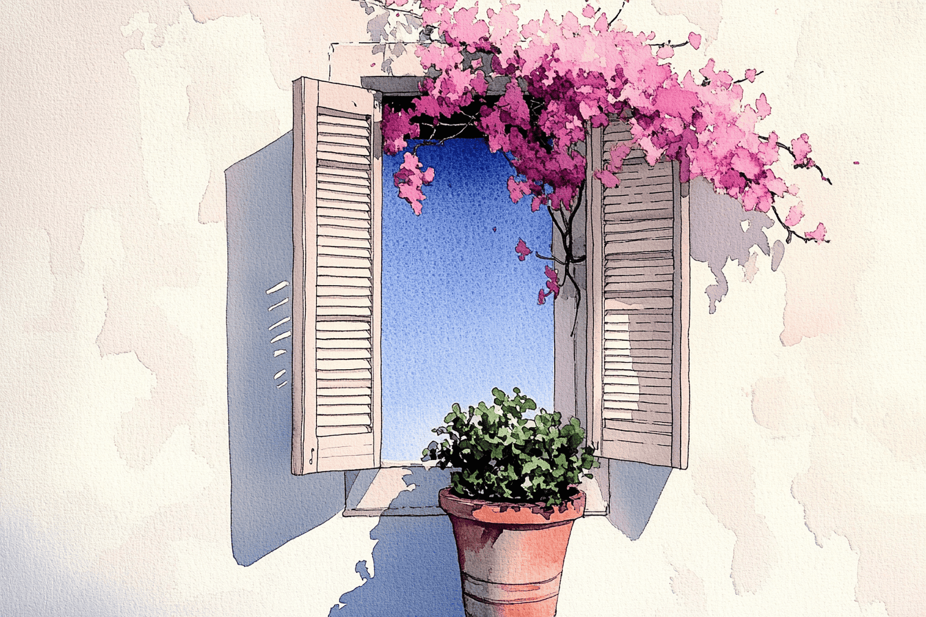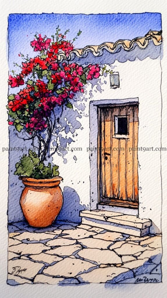 For the focal point, use a saturated wet-on-dry technique to layer the bougainvillea flowers, starting with a bright pink and dropping in deeper reds while wet to create volume. Finally, wash the door and pot with warm earth tones, leaving small slivers of white paper exposed to act as “sparkle” or direct highlights where the sun hits the most.
