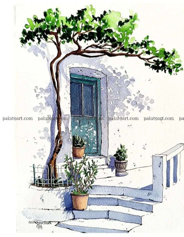 For the details, use a fine liner or a small round brush to apply the dark, architectural lines of the door and the twisting trunk of the tree. Finish by layering the foliage with “dabs” of vibrant greens, allowing some colors to bleed together while keeping the edges crisp to mimic sunlight filtering through the leaves.