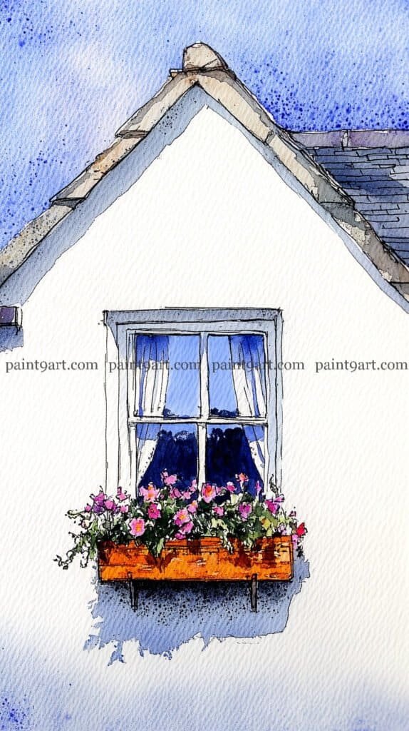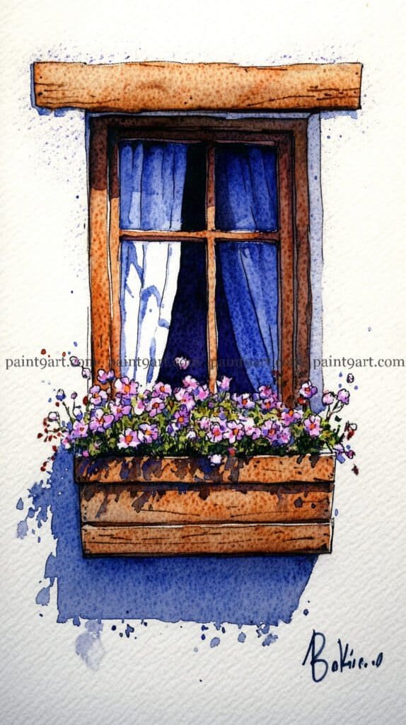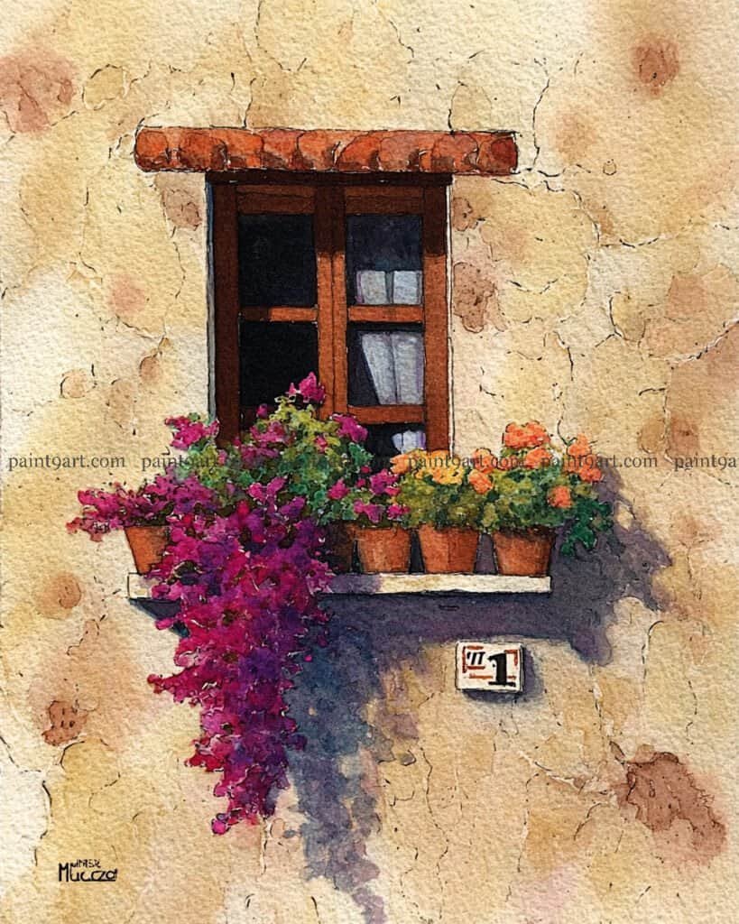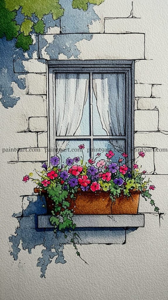 For the window box, use a saturated dabbing technique for the colorful petunias, mixing vibrant pinks, reds, and purples to create a dense, cheering display. Pull some of the green pigment downward in thin, trailing lines to suggest climbing ivy spilling over the stone sill. Finish the painting by glazing a deep, cool-toned shadow to the left of the window using a variegated wash; this grounds the window box and creates the illusion of bright, morning sunlight hitting the facade.