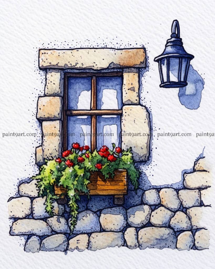 For the foliage and florals, use a layering technique; start with a light sage green for the shutters and a pale yellow-green for the leaves. Once dry, go in with a concentrated red to “pop” the flowers in the window box and beside the door. Finally, add the final dark accents—like the door handle and the deep shadow inside the window—using a dry-brush technique to ensure these small details remain sharp and don’t bleed into your lighter washes.