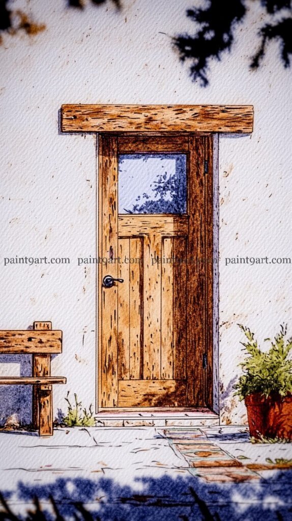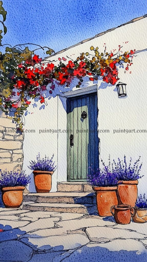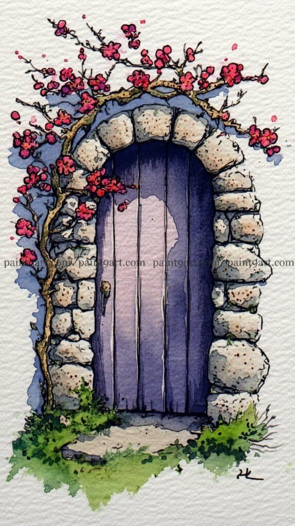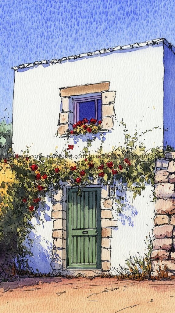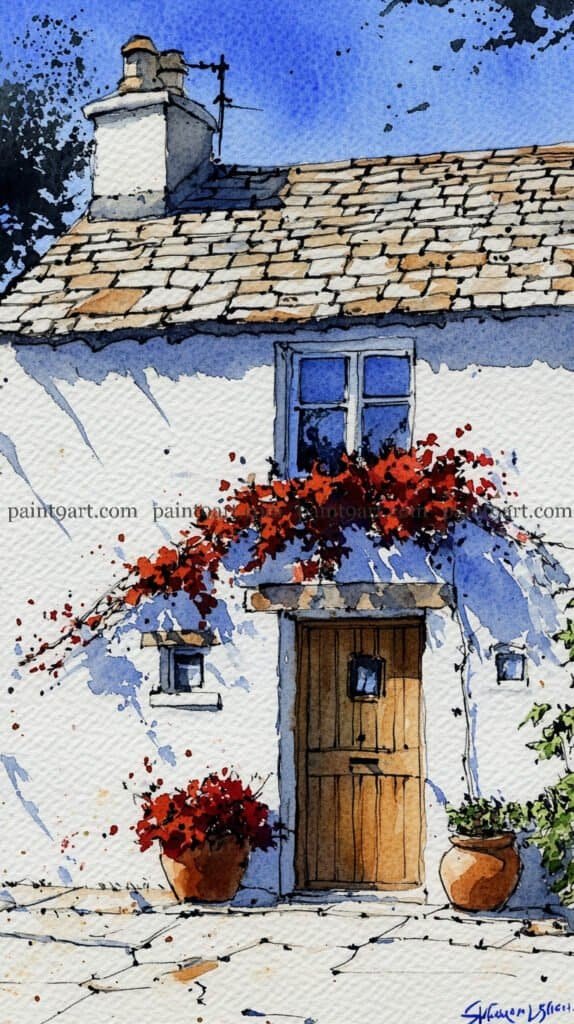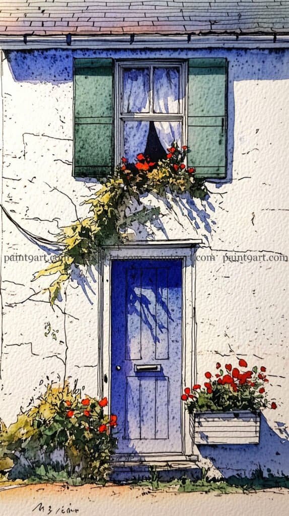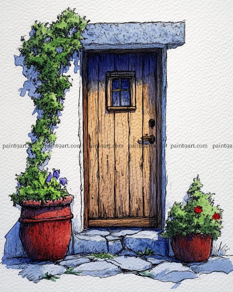 For the wooden elements, apply a flat wash of warm ochre to the door and terracotta pots, adding vertical lines for the door planks once the base is dry to maintain structural crispness. Use a granulating wash of cool grey and sienna for the stone patio, leaving plenty of “sparkle” (unpainted paper) to represent the sun hitting the uneven ground. Finish the piece by adding sharp, dark accents to the window panes and the door’s hardware with a fine brush, and use a splatter technique with diluted red to suggest falling petals near the base.