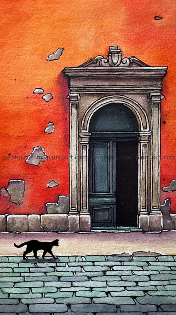 For the cobblestone street, use a multi-tonal wash of muted greens and greys, painting individual stones with slightly different saturations to suggest age and wear. To finish, paint the silhouette of the cat using a highly concentrated black pigment, ensuring the “tail-up” posture is crisp to convey motion. Add a very thin, horizontal blue-grey shadow beneath the cat to ground it to the pavement, making sure this shadow aligns with the larger architectural shadows cast by the doorway’s columns.