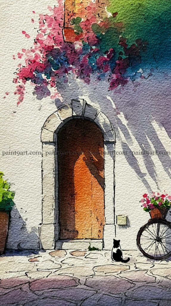 Start with a light ink sketch to define the stone arch and the gentle curve of the bicycle wheel. For the main facade, leave the paper white, but apply a wet-on-wet technique for the upper corner; drop in a mix of soft pinks, purples, and deep greens to suggest overhanging flowers and foliage. While this area is still damp, pull down long, diagonal “shadow streaks” using a very diluted violet-blue to mimic the effect of light filtering through leaves onto the white wall.