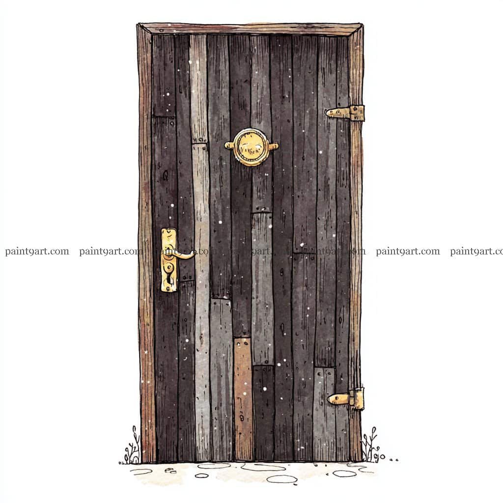 For the hardware, use a saturated wet-on-dry application of bright gold or yellow ochre, leaving a tiny sliver of white paper for a direct highlight to suggest a metallic sheen. Use a fine brush to add the tiny white “splatter” or “grain” effects across the door once it is completely dry to mimic peeling paint or dust. Finish by adding the delicate, minimalist grasses at the base with a few quick, gestural strokes to ground the door in its environment.