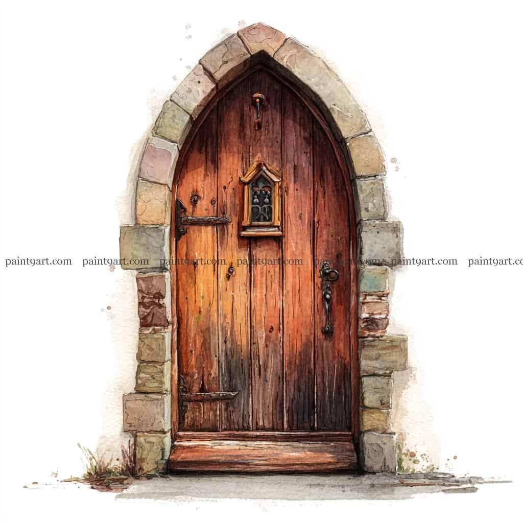 To finish, use a glazing technique to add a deep, cool-toned shadow within the recessed curve of the arch and at the very base of the door to provide structural depth. Dapple in small patches of mossy green and earthy brown at the threshold using a dry-brush technique to ground the entrance in its environment. Finally, add a touch of concentrated yellow or gold to the small window frame and the door handle to provide a subtle metallic contrast against the dark, heavy timber.