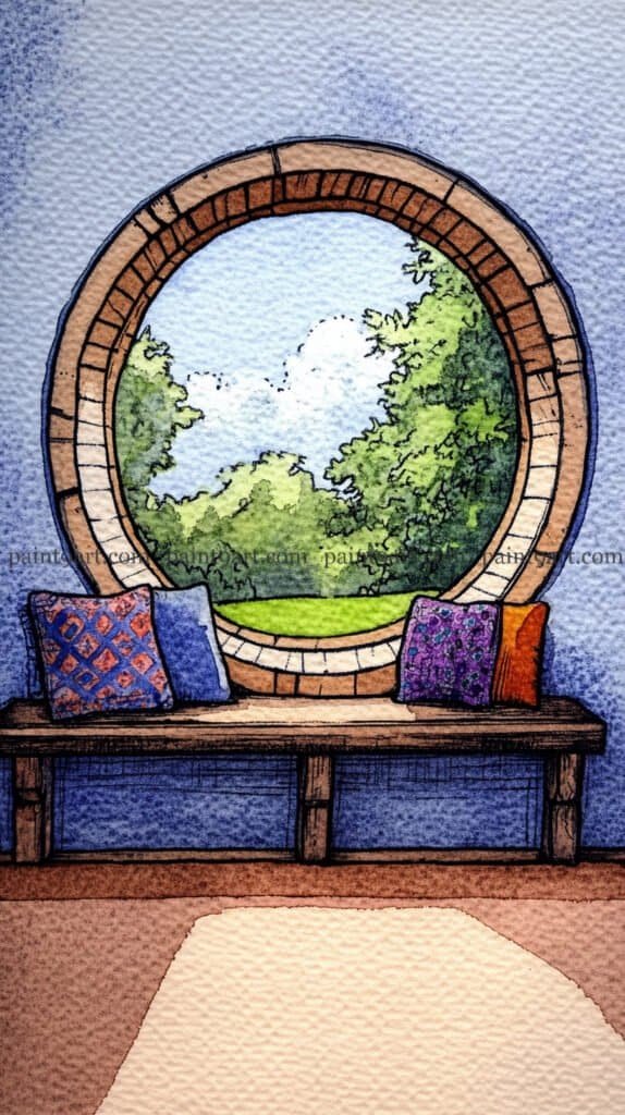 Begin by sketching the large circular window and the wooden bench with a waterproof fine-liner, using concentric lines to define the depth of the window frame. For the outdoor scene, apply a graduated wash for the sky and use a wet-on-wet technique for the trees, dropping in bright yellows and greens to suggest sunlight hitting the leaves. Inside, apply a granulating wash of deep blue to the walls to create a cozy, textured atmosphere that contrasts with the bright, smooth light of the outdoors.