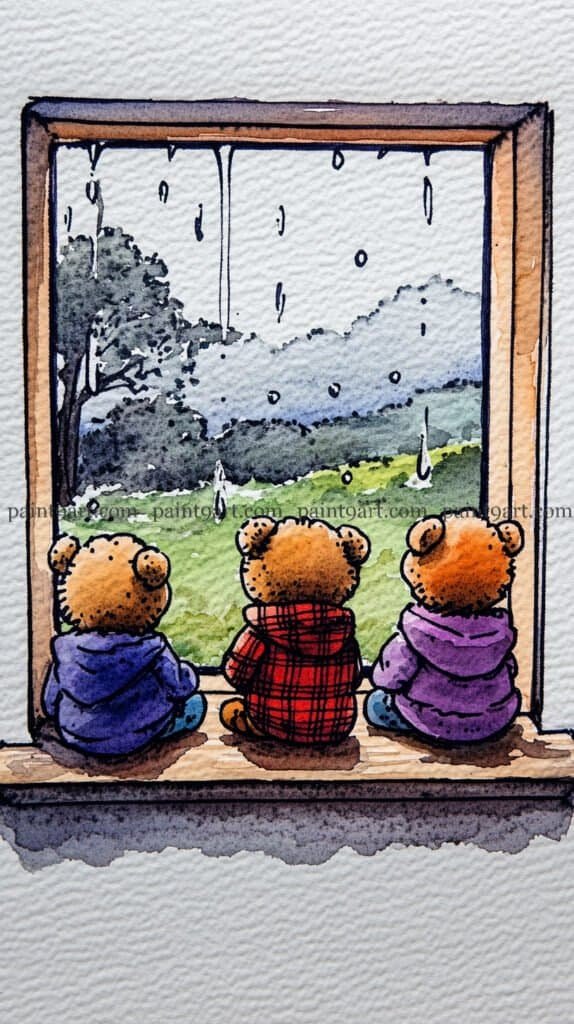 Start with a charming ink sketch of the three bears from behind, focusing on the different textures of their hoodies—denim, plaid, and fleece. For the view outside, use a wet-on-wet technique with very diluted greens and greys to create a misty, soft-focus meadow and treeline. While the background is damp, use a “lifting” technique or a touch of white gouache to create the vertical streaks of raindrops and the larger “splashes” hitting the windowpane.