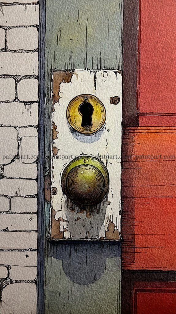 To finish, focus on the metallic elements by applying a saturated wet-on-dry wash of olive green and ochre to the doorknob, leaving a tiny sliver of white paper for a sharp, sunlit highlight. Use a glazing technique with a deep indigo to cast the heavy, rounded shadow beneath the mounting plate, which instantly lifts the hardware off the flat surface. Finally, add a touch of concentrated black to the keyhole itself to create a sense of internal depth and complete the realistic, high-contrast effect.