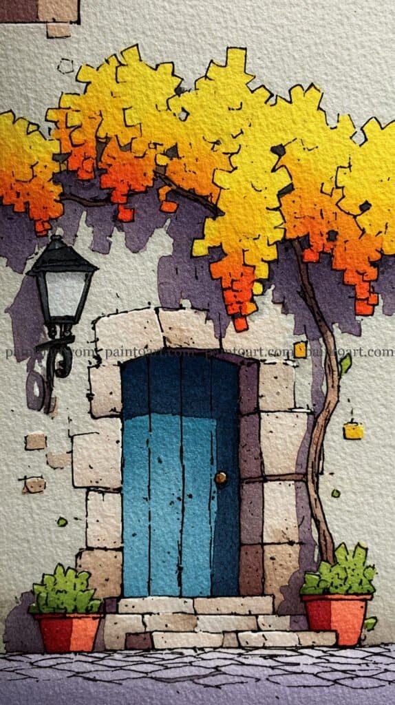 For the focal point, use a variegated wash on the tree, blending Lemon Yellow at the top into a fiery Cadmium Orange at the bottom of the clusters to suggest a glowing, autumnal light. Paint the door with a flat wash of bright teal, adding a strip of deep indigo at the top to indicate the recessed shadow of the stone arch. Finish by dabbing vibrant greens for the potted plants and using a multi-tonal wash for the cobblestones, alternating between cool greys and soft purples to mimic the reflected light from the sky and shadows.