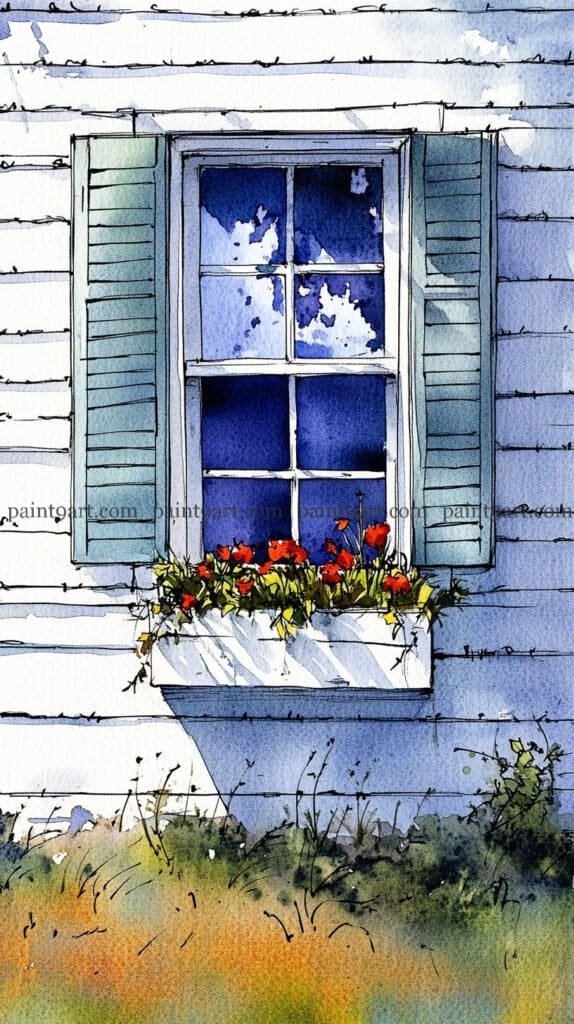 Begin by sketching the window and siding with a steady hand, ensuring the horizontal lines of the weatherboarding are parallel to ground the composition. For the window glass, use a wet-on-wet technique within the panes; drop in patches of saturated blue and leave jagged white spaces of dry paper to represent clouds. This high-contrast reflection is what gives the glass its “shine,” so resist the urge to fill it in completely.