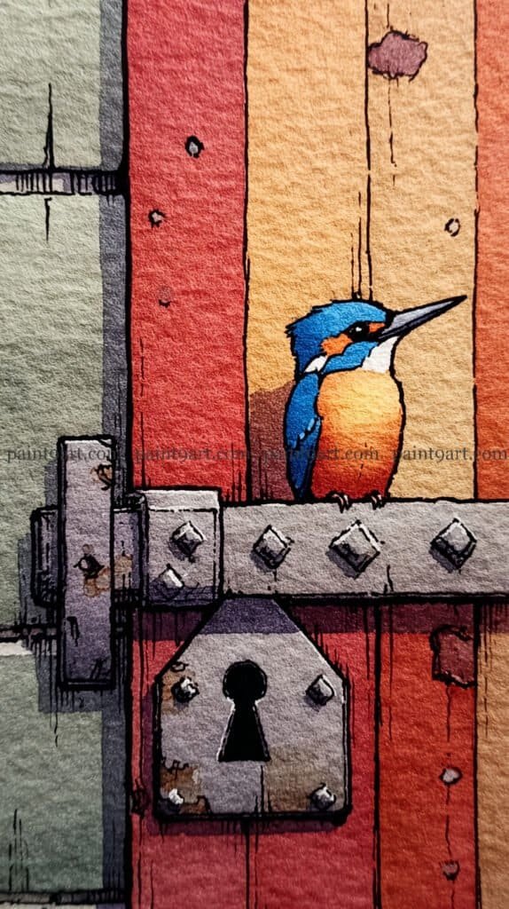To paint the kingfisher, use a wet-on-dry technique for the vibrant blue feathers, leaving a tiny dot of white paper in the eye for a “spark of life.” For the metal latch, use a granulating wash of grey and purple to mimic the texture of aged iron, then add small “rust” spots with a dry-brush flick of burnt sienna. Finish the piece by deepening the shadows around the keyhole and under the bird’s feet to ground it firmly on its perch.