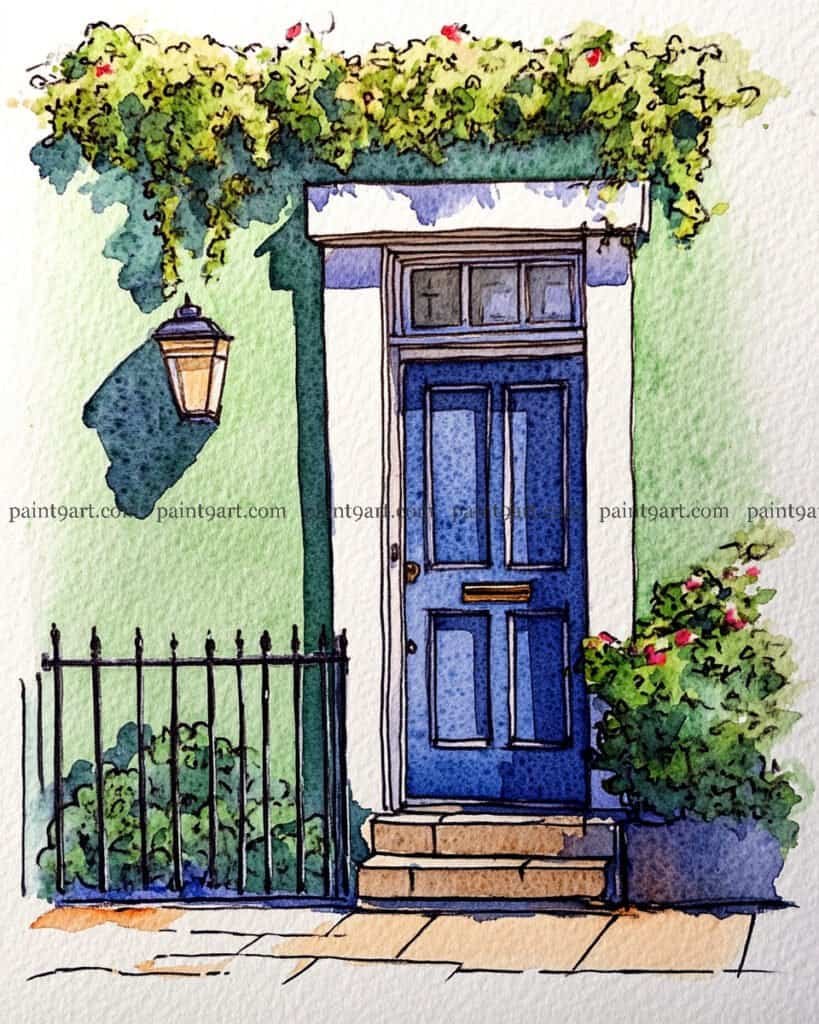 For the focal point, apply a saturated wet-on-dry wash of deep blue to the door panels, leaving a tiny bit of white paper or a lighter blue for the door handle and letterbox to suggest a metallic sheen. Use a dabbing technique for the lush foliage at the top and in the planter, mixing various greens and yellows to create a sense of density. Finish by adding small “dots” of red or pink for the flowers and using a dark glaze for the shadows beneath the steps and the base of the railing to ground the entire scene firmly to the sidewalk.