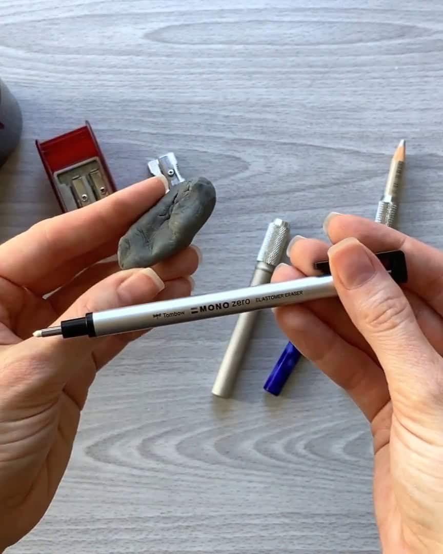 - Tombow Mono Zero eraser: This is a small, precise eraser. I use it to erase tiny details, but honestly, I love it so much I use it for everything!