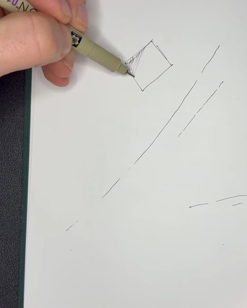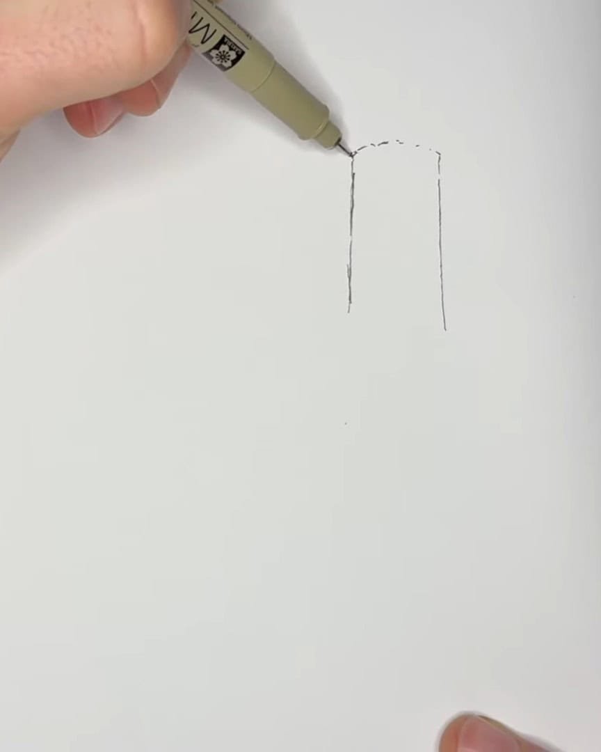 The artist starts by drawing a soft arc connecting the two vertical lines. A 01 pen is used, but the artist doesn’t fully connect all the lines. This leaves room for adjustments.