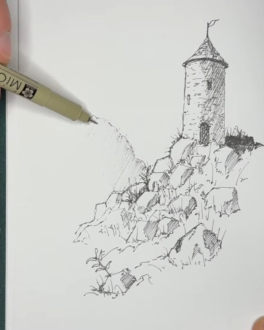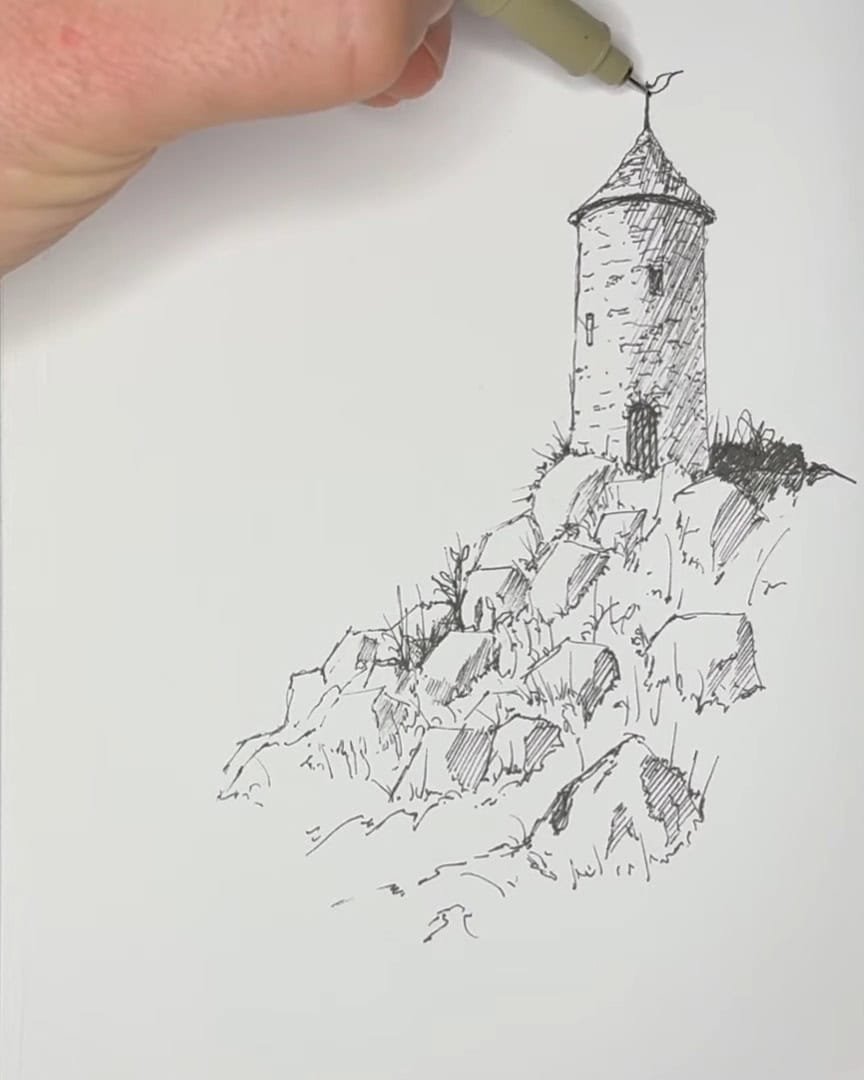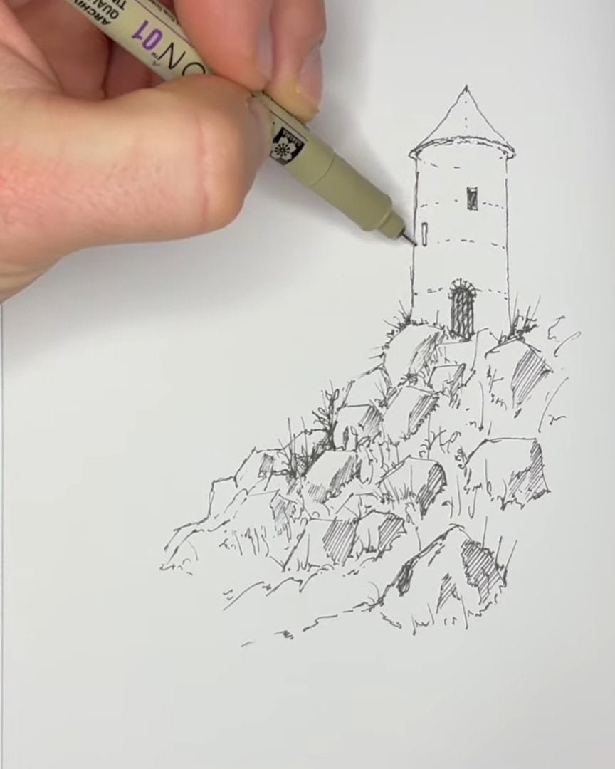 In this tutorial, the artist walks readers through drawing a charming castle with rocks and details, using basic hatching techniques and clever shading to create depth and interest.