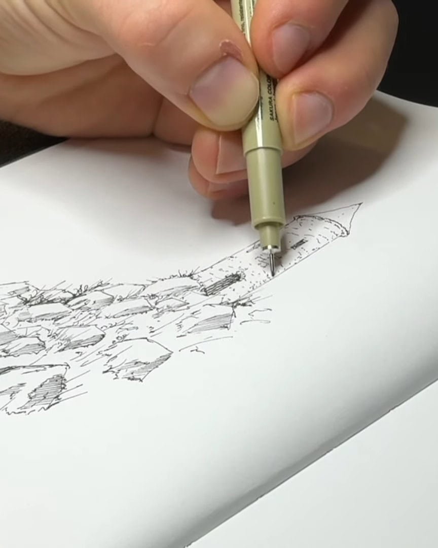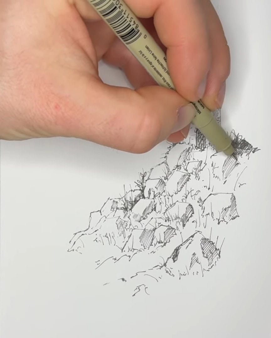 Ink drawing thrives on contrast between light and dark. Knowing where to place shadows — and where to leave highlights — is crucial. The artist carefully hatches the shadows while leaving parts of the rocks white to show where sunlight hits.