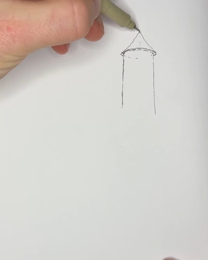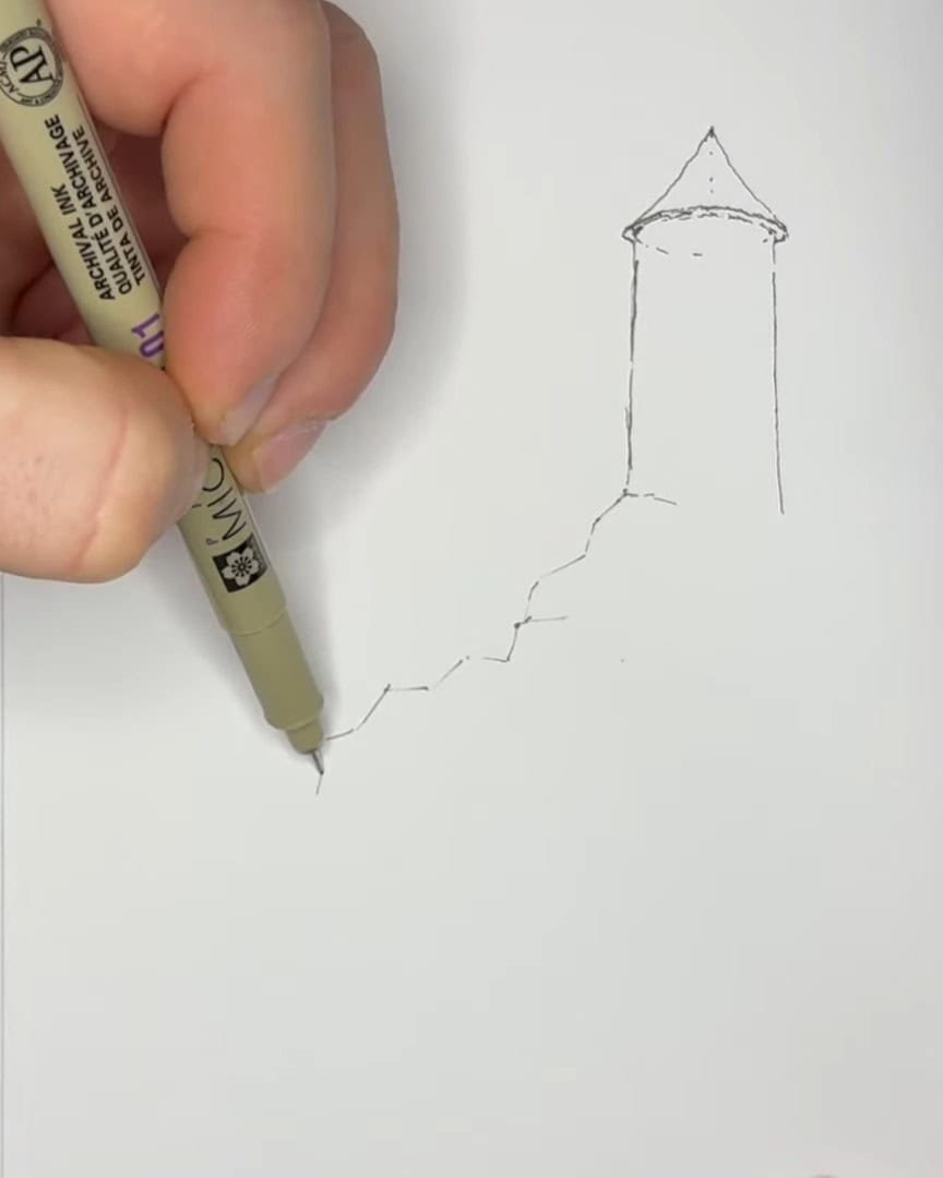 The lines may wobble, and that’s perfectly fine. Wiggly, imperfect lines add charm and personality to pen drawings. More details will be added to the castle later.