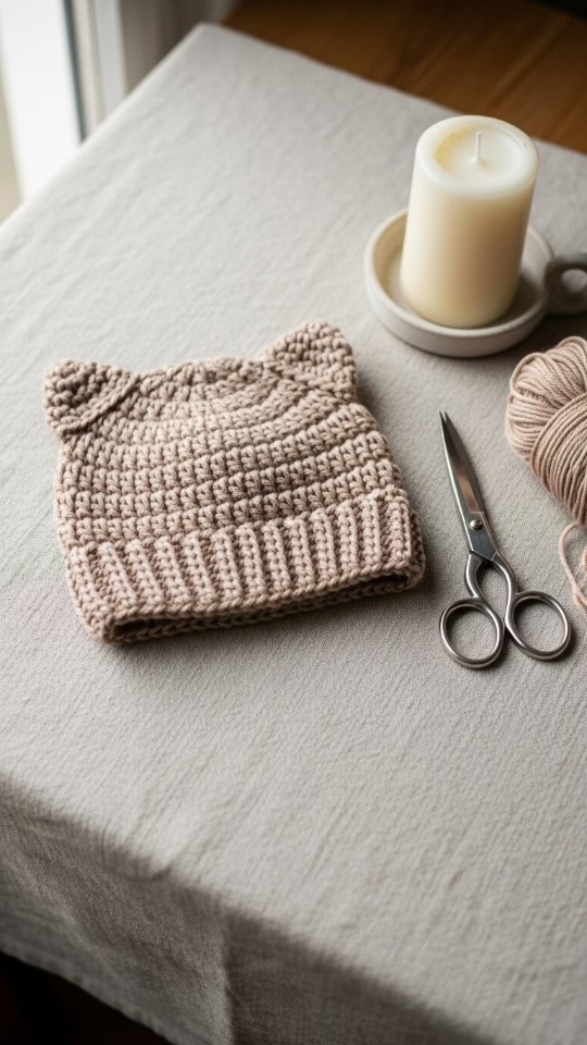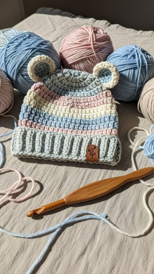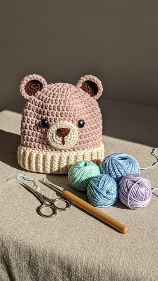 I love the soft charm of a pastel bear beanie. It’s simple to make using medium-weight yarn and a 5mm crochet hook. The playful bear ears bring extra cuteness, perfect for toddlers or newborns.