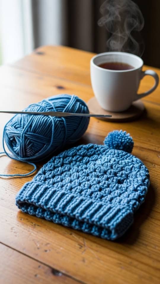 Soft and stretchy, the sky-blue crochet beanie feels perfect for cold weather. I make it with #5 bulky yarn using a 6 mm hook. It fits most women’s heads at 20 inches around and stands 9.5 inches tall.