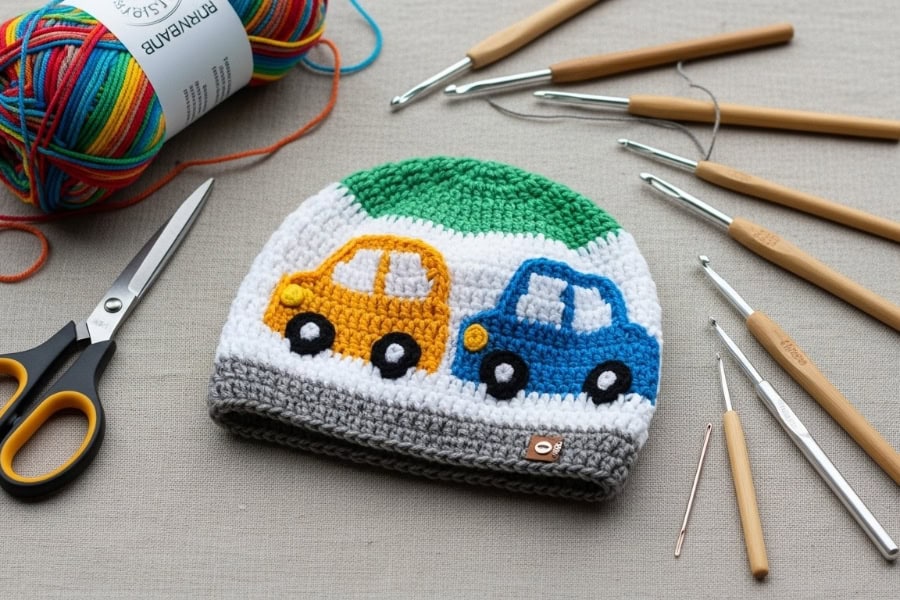 The blue hat with checkered trim looks so cool. I enjoy adding the red and yellow crocheted car appliques. They make the beanie extra fun.