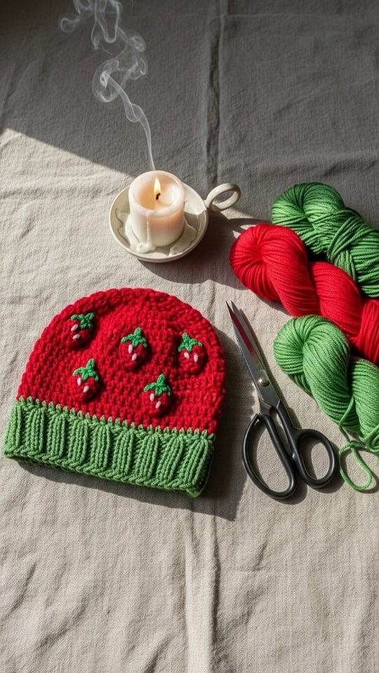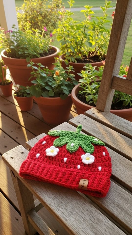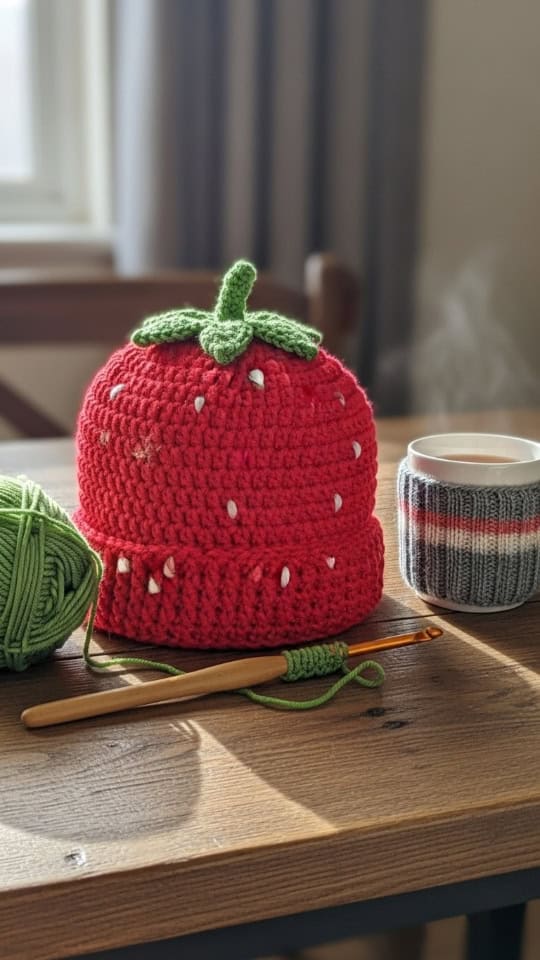This strawberry crochet beanie makes any outfit sweeter. Its soft 100% acrylic fabric feels cozy and kind to the skin, perfect for colder months.