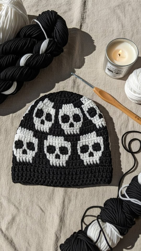This skull-patterned beanie gives off a cool, gothic vibe. I love how it mixes creativity and edge with its unique design. The pattern costs $5.00 on Etsy, sold by SimplyMeHolly as a digital PDF download.