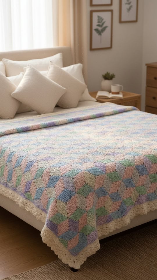 I love how the 3D crochet blanket looks modern and unique. It uses layered geometric blocks to form a rich texture.