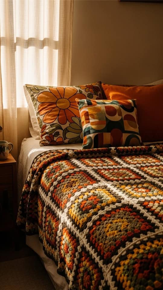 I love retro crochet patterns. Warm oranges, browns, and earthy tones bring back the cozy vibe of the 1970s.