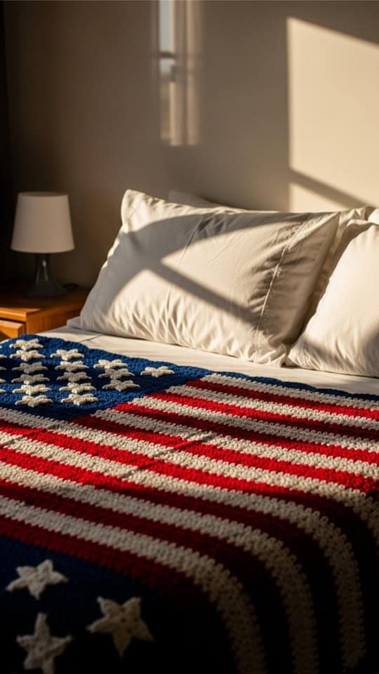 Bright reds, crisp whites, and deep blues come together in this pattern. The American flag crochet blanket measures a generous 44” x 69”. Double-sided with five-sided stars worked directly into the design, it feels both sturdy and soft.