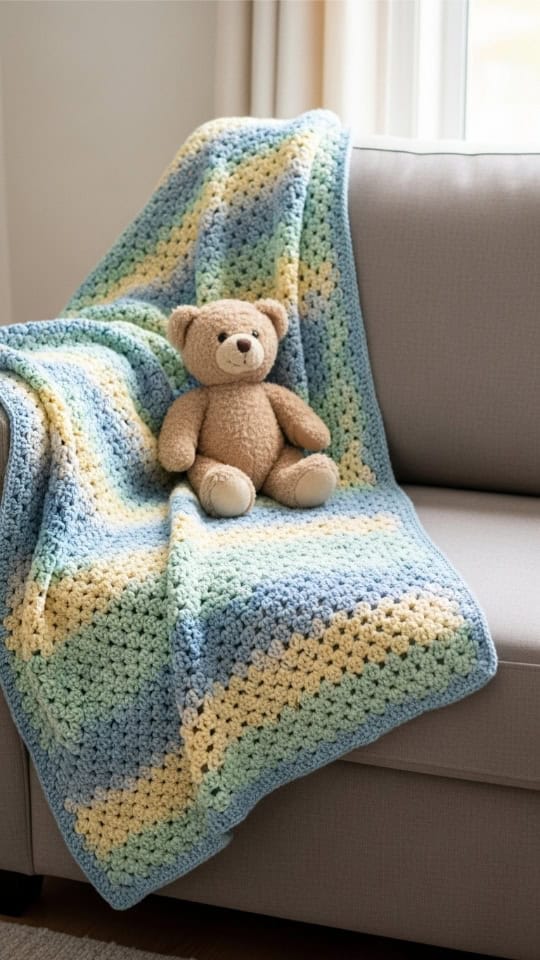 Sherbet Ripple Baby Blanket adds pastel softness, while Rainbow Bobble Heart Square brings playful texture with bobbles. Double and triple crochet stitches make the blanket plush and cozy.