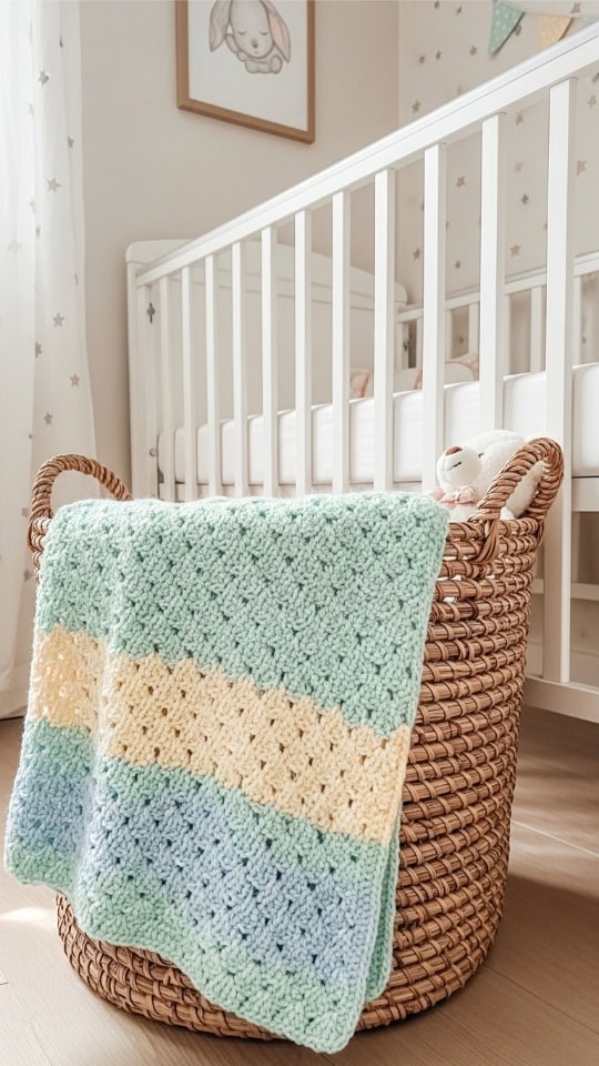 I used the even moss stitch for this blanket. It has earthy stripes that make it feel warm and cozy. The crab stitch border adds a cute finishing touch.