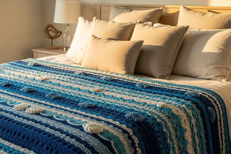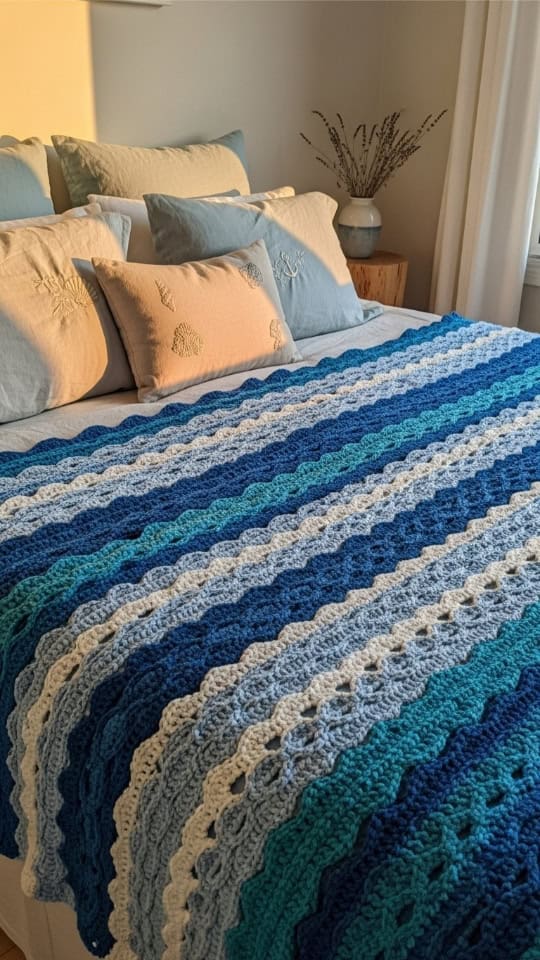 The Ombre High Tide Crochet Blanket blends different blues in a ripple pattern, mimicking gentle waves.