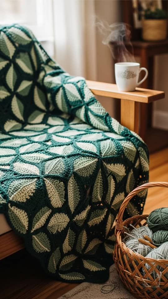 The Spiritual Lotus Blanket offers cool geometric vibes for chilly evenings. Every stitch links nature’s beauty to your hands. These crochet patterns are heirloom-worthy treasures with an artistic flair!