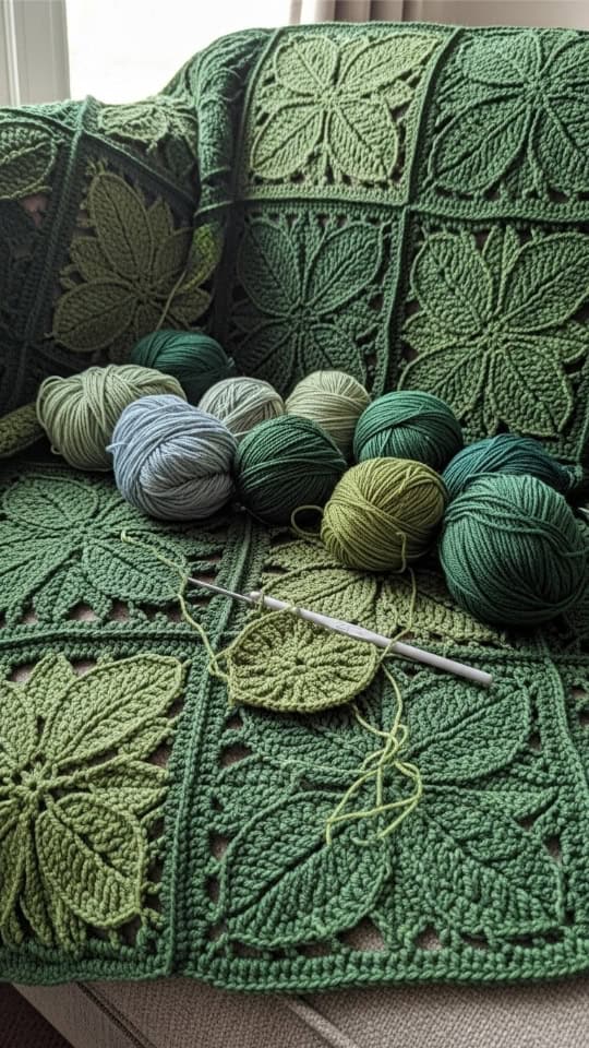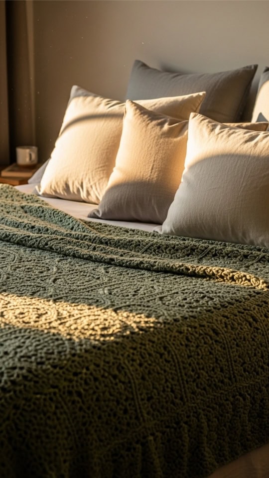 I enjoy the calm of a green crochet blanket. Olive tones feel earthy and soothing. This style reminds me of nature’s peace. Many artists love it for handmade decor.