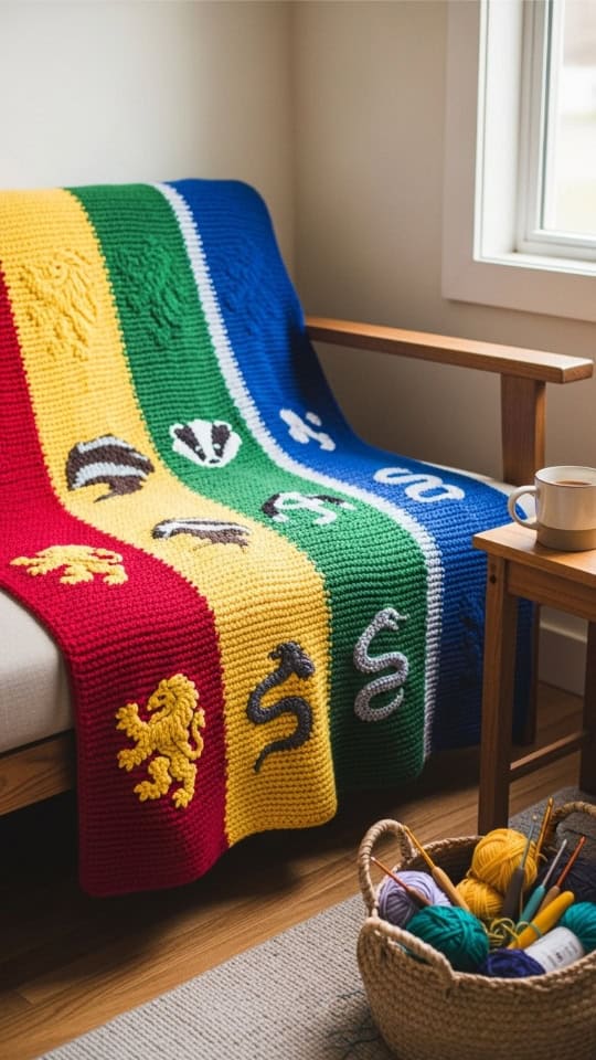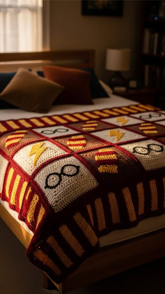 I love the magic this Harry Potter crochet blanket brings to life. It features fun motifs like wands, glasses, and lightning bolts. The patterns work well for fans of all skill levels.