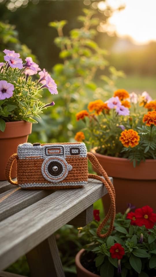 I spotted a crochet camera pouch surrounded by colorful garden flowers on an outdoor bench. Its simple, beginner-friendly design caught my eye.