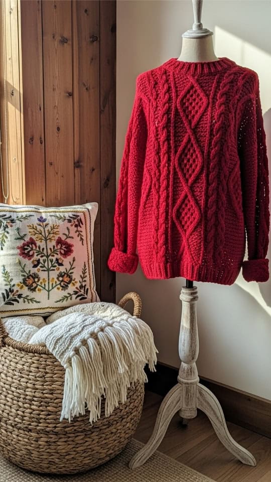 This soft neutral crochet sweater feels so elegant. It has delicate bows that give it a vintage charm. I love how it pairs well with cotton yarn or even luxurious cashmere for extra softness.