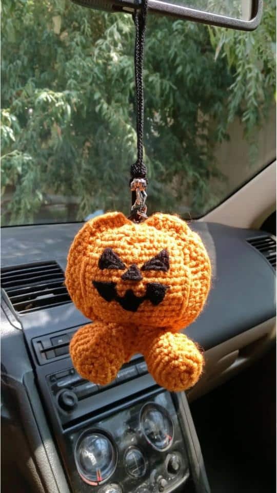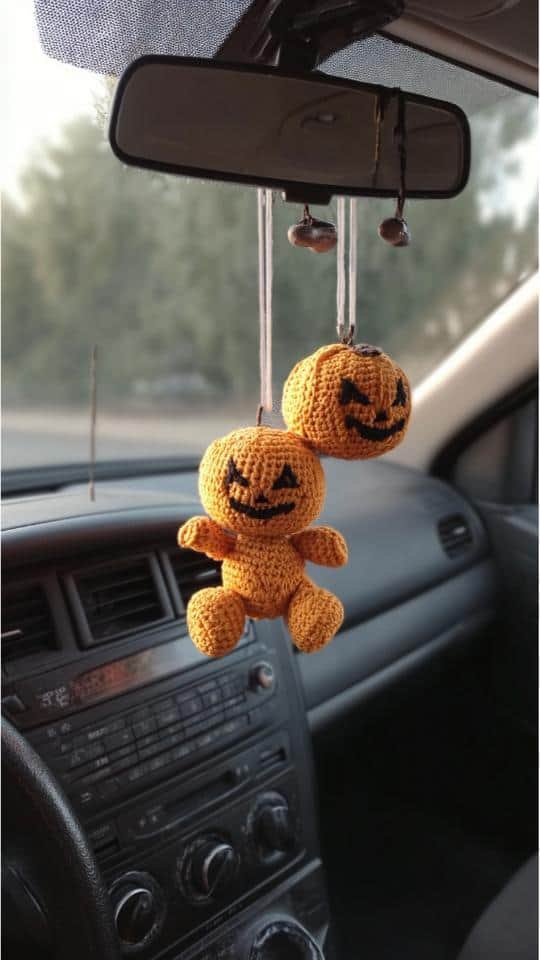 I love adding handmade touches to my car, and these crochet pumpkin hangings are my favorite this season. One is just a head, and the other has a full body—they look so cute swinging side by side.