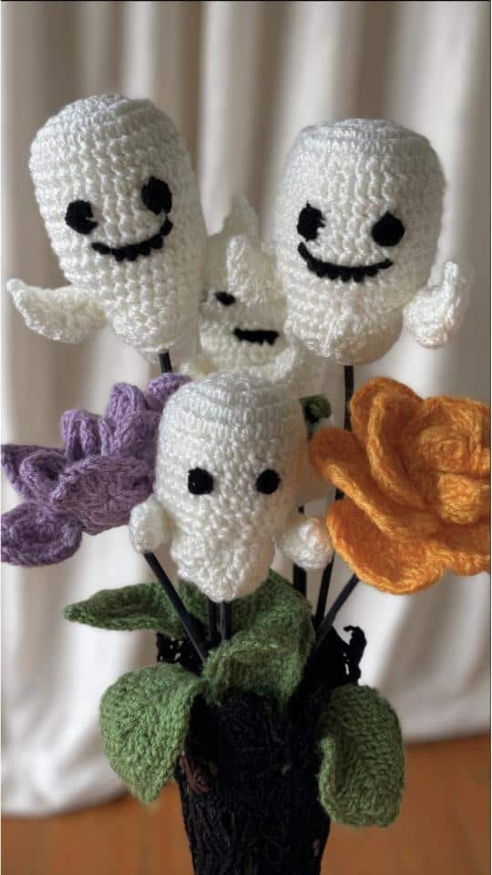Since I enjoy trying new Halloween crafts, I make a crochet ghost bouquet instead of the usual pumpkins. The smiling ghosts with bright flowers always make my table look fun.