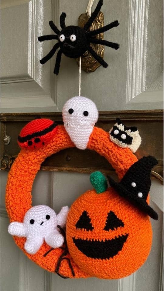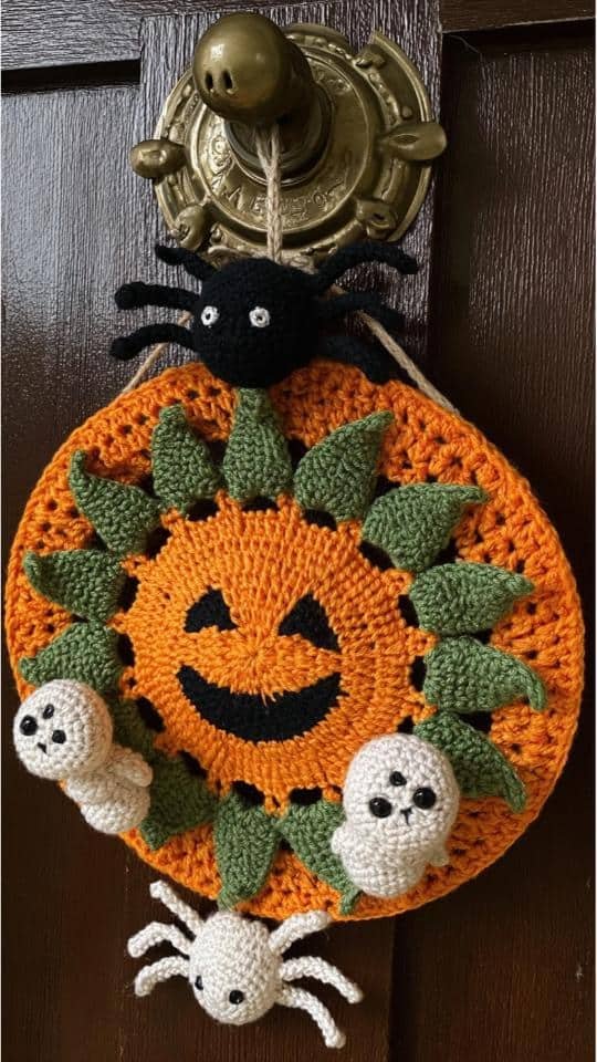 A festive door always sets the mood. I crochet wreaths using pumpkins, ghosts, and tiny spiders to decorate my entryway.