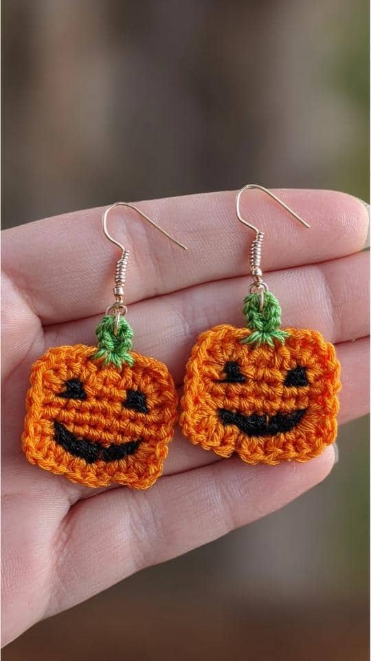 Cute earrings make any outfit more fun, don’t they? I crochet tiny pumpkins and skulls to add something special to my Halloween look.