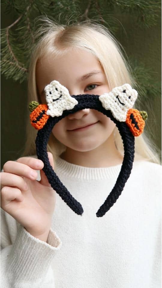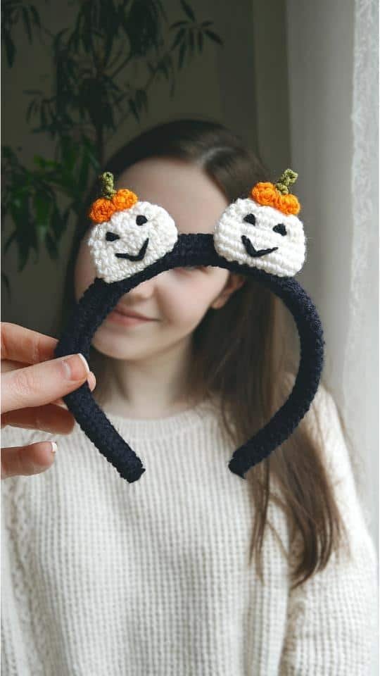I make a few tiny ghosts and pumpkins, and one with cheerful white pumpkins. They’re soft, easy to wear, and super cute for fall.