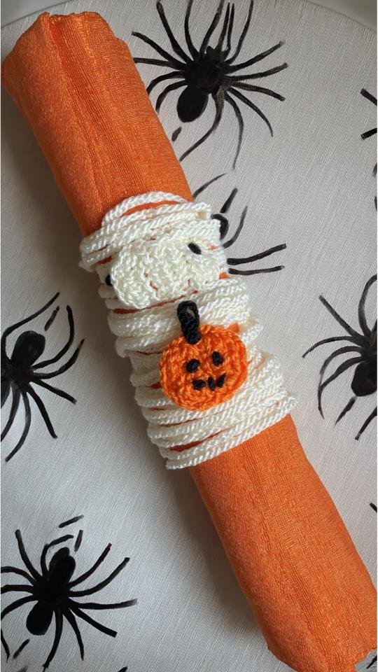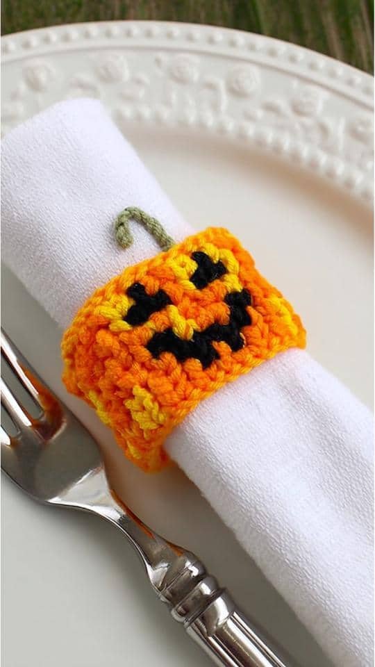 I like to dress up my table with crochet napkin rings for Halloween dinners. The bright pumpkins and playful faces always stand out against the napkins.