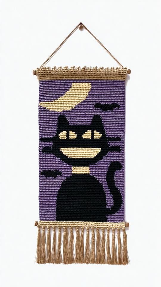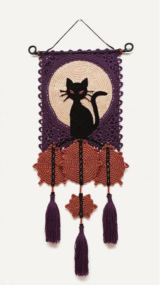 Want a Halloween decoration that really stands out? I crochet wall hangings like this black cat with bats and a golden moon—it always makes people pause and look.