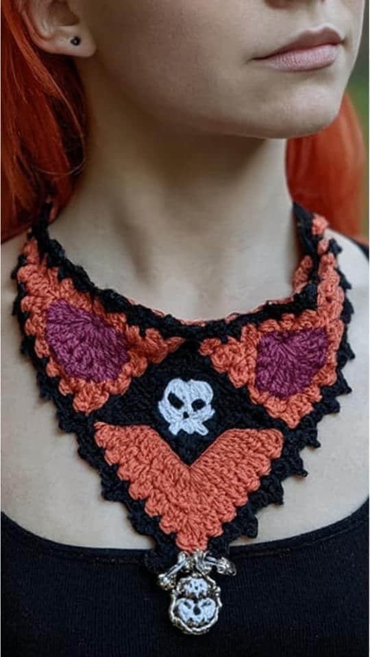 There’s something fun about wearing a festive bandana in October. I crochet mine with pumpkin faces, bones, and candy corn colors to make it stand out.