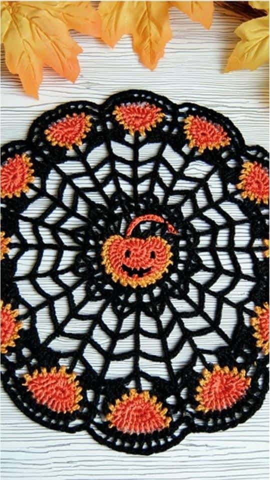 These Halloween doilies are some of the most fun pieces I’ve ever made. I use thin black yarn to shape the web, then add bright pumpkins around the edge. The middle one with a smile makes me grin every time.