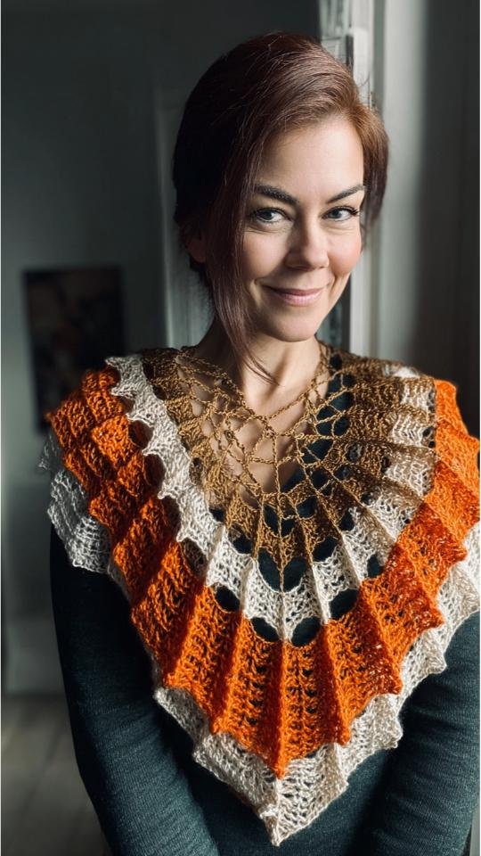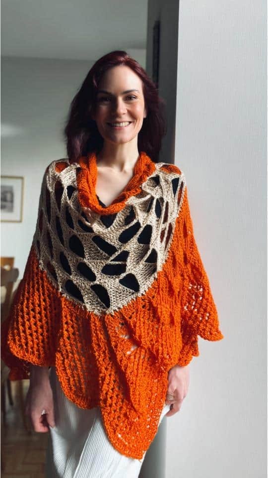Looking for something festive but still easy to wear? I always reach for my crochet shawl when the weather cools down. The warm mix of orange, cream, and brown fits right in with fall.