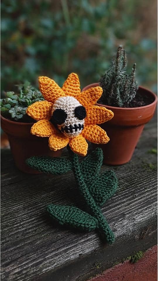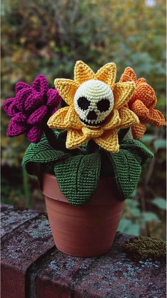 I find these crocheted flowers a perfect blend of playful and creative for Halloween decor.