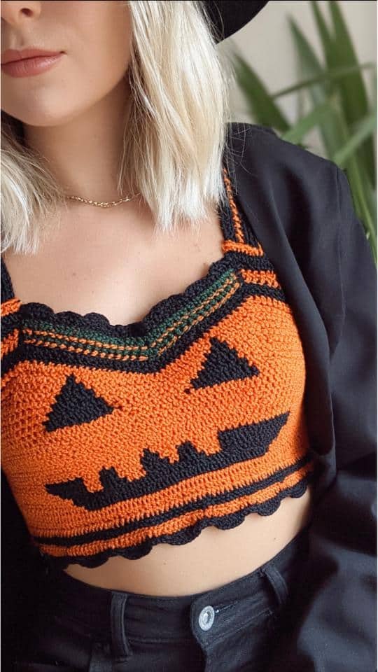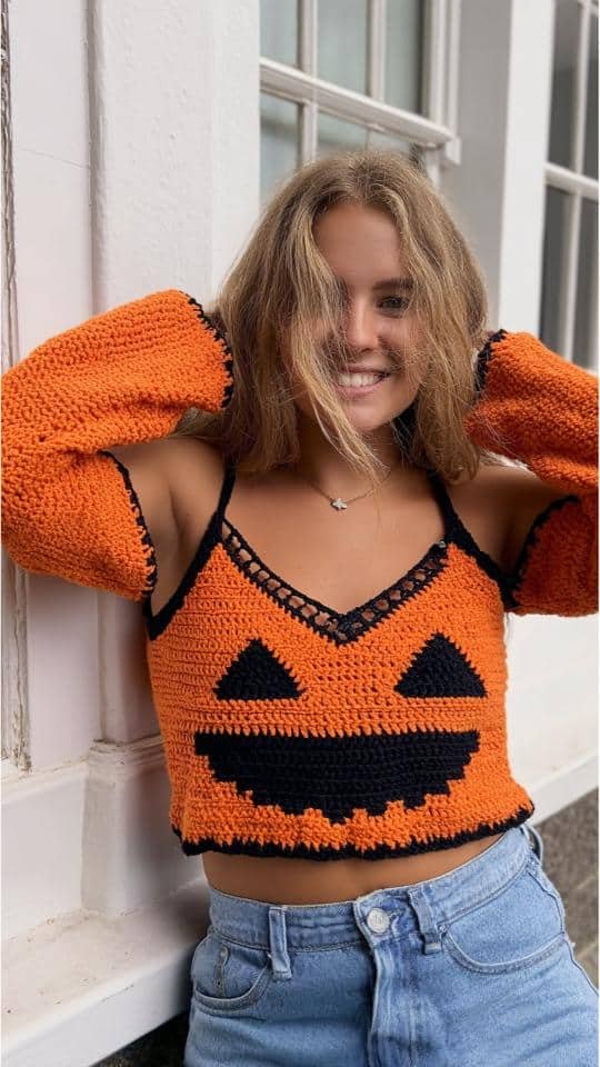 Ever tried wearing a crochet Halloween top with a bold pumpkin face? I find it instantly brightens my look and adds a playful twist to fall outfits.