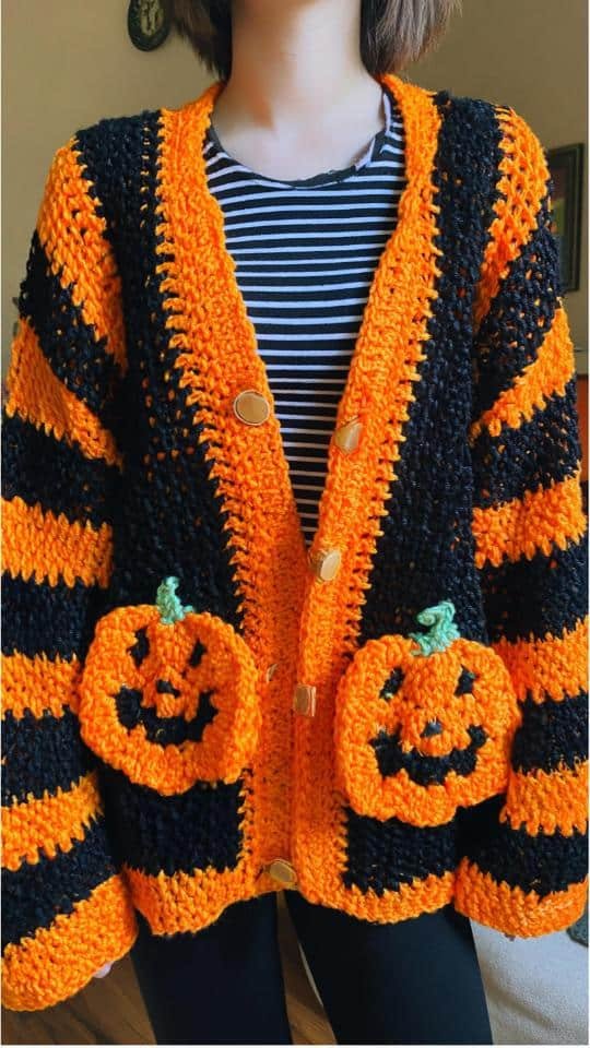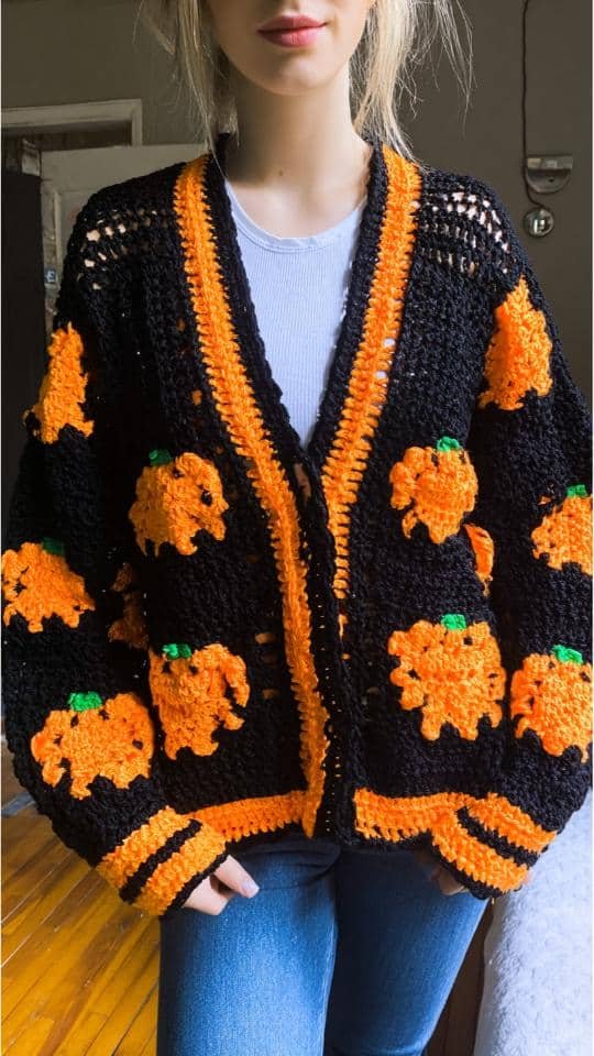 Wearing one instantly lifts my mood and adds a special look to simple outfits. If you enjoy cozy handmade clothing, this cardigan is a great project to show off your Halloween spirit.